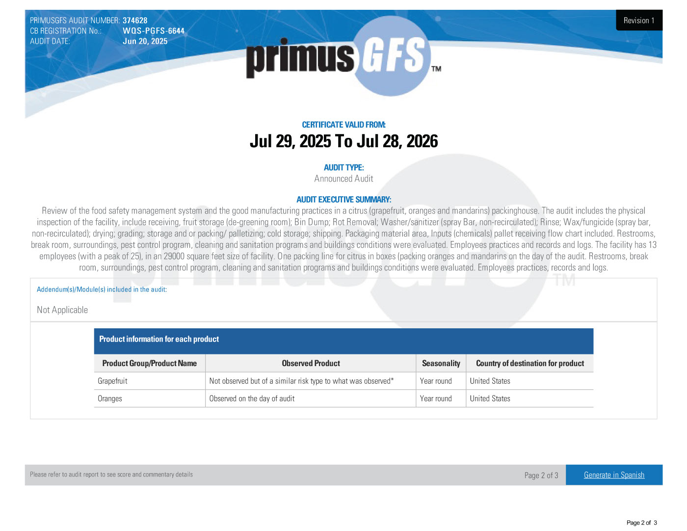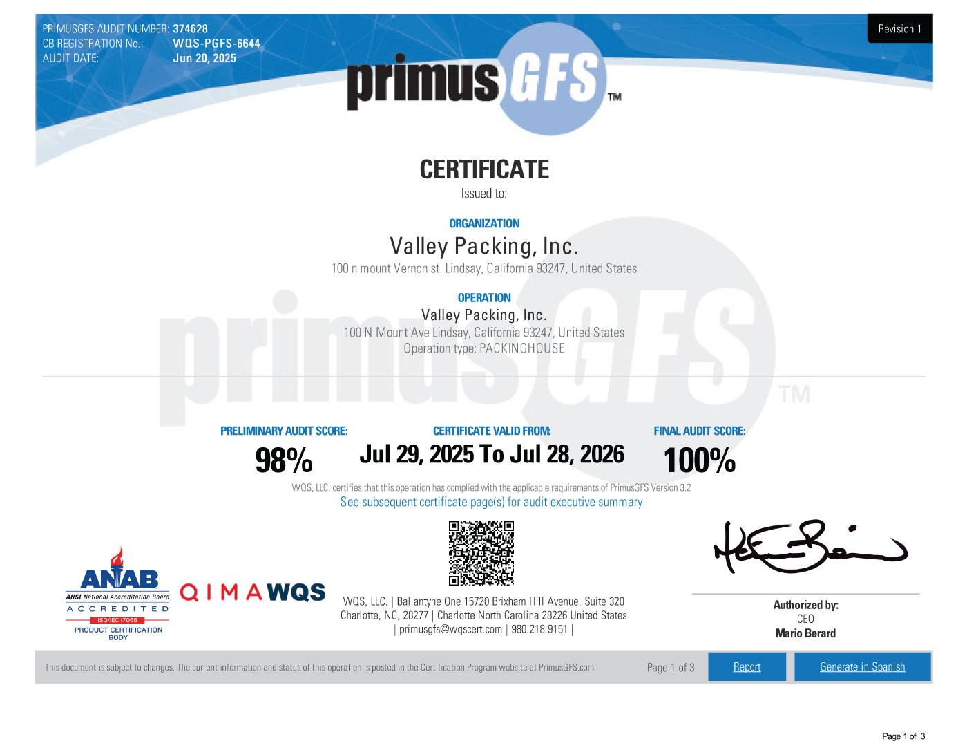 Proudly Certified: PrimusGFS for Quality & Responsibility